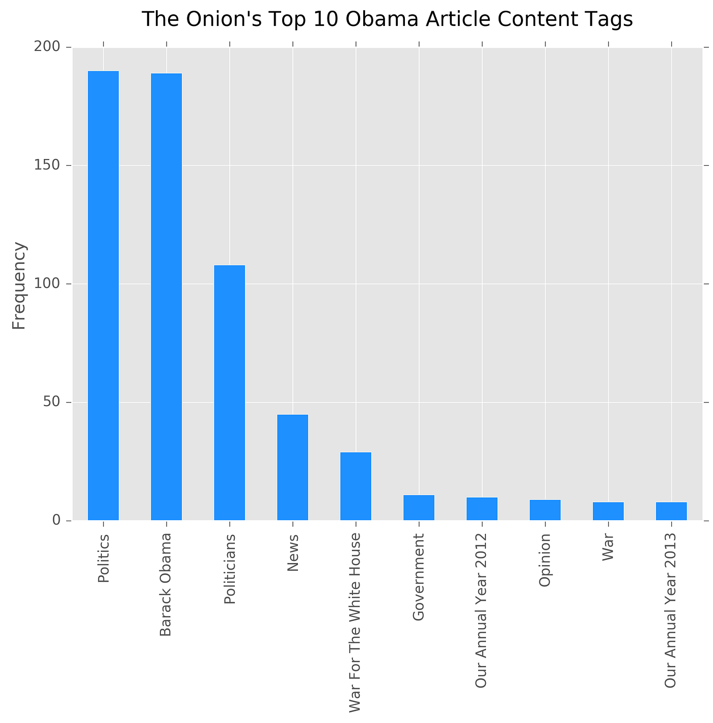 This is reasonable. The purpose of tags is to consolidate information into a coherent set of lists. The specific tags used are not startling: “Politics,” “Barack Obama,” “Politicians,” and “News” make up the lion’s share of even the top ten most used descriptors. It appears, however, The Onion considers their Obama coverage to be some of their best, at least in the middle of his terms. “Our Annual Year 2012” and “Our Annual Year 2013,” which are roundups of top stories, both make an appearance in the top ten tags.